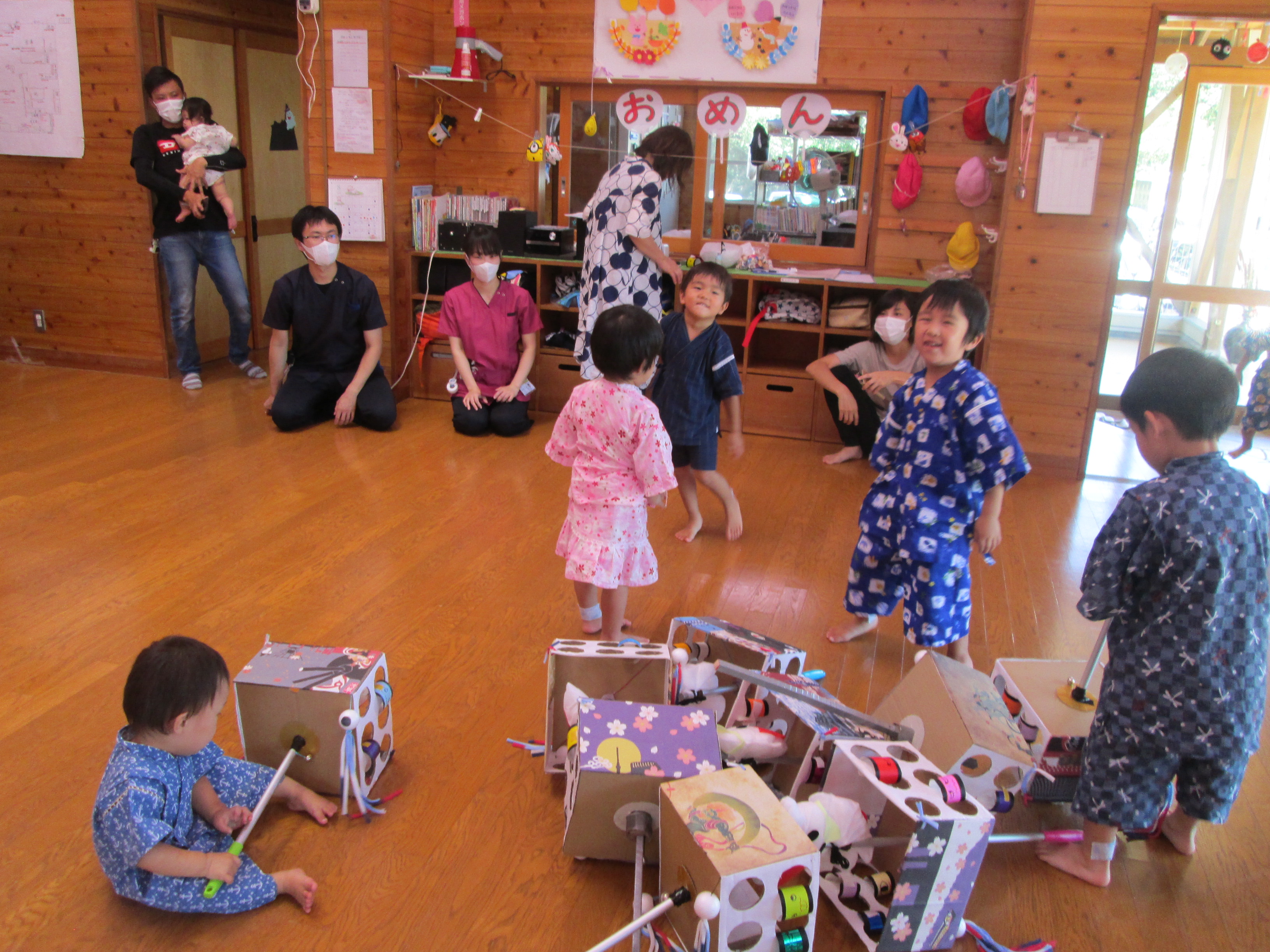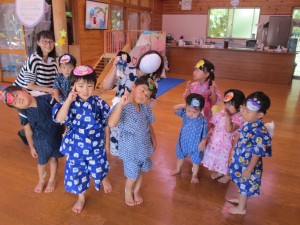 託児所で親睦会を行いました。今年は、新型コロナウイルス感染症拡大を受けて夏祭りも中止となっています。雰囲気だけでも楽しめたことと思います。