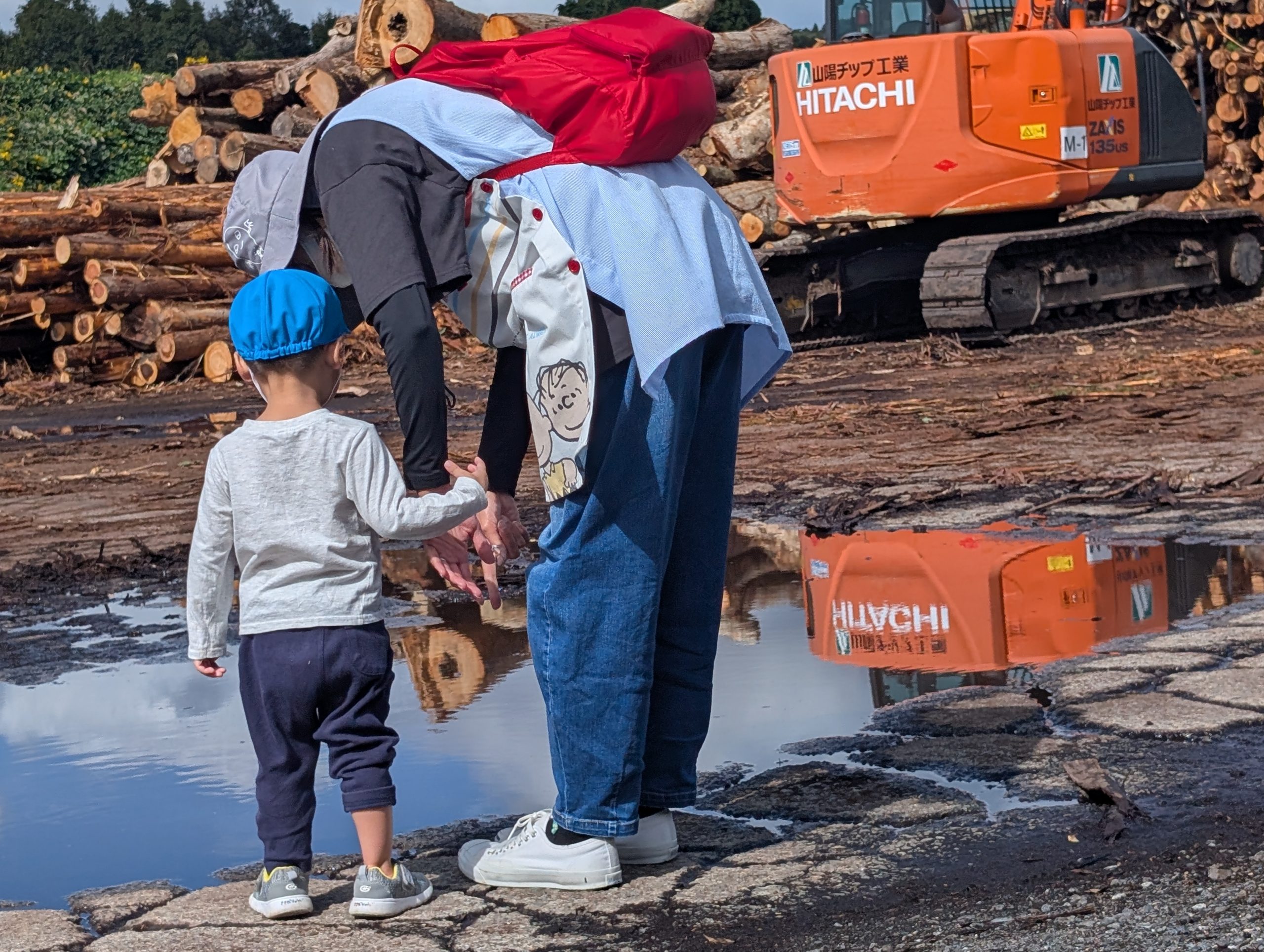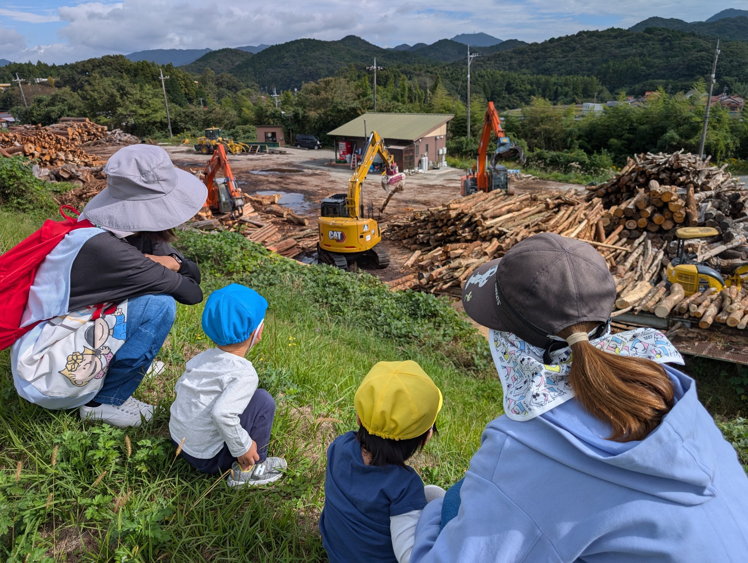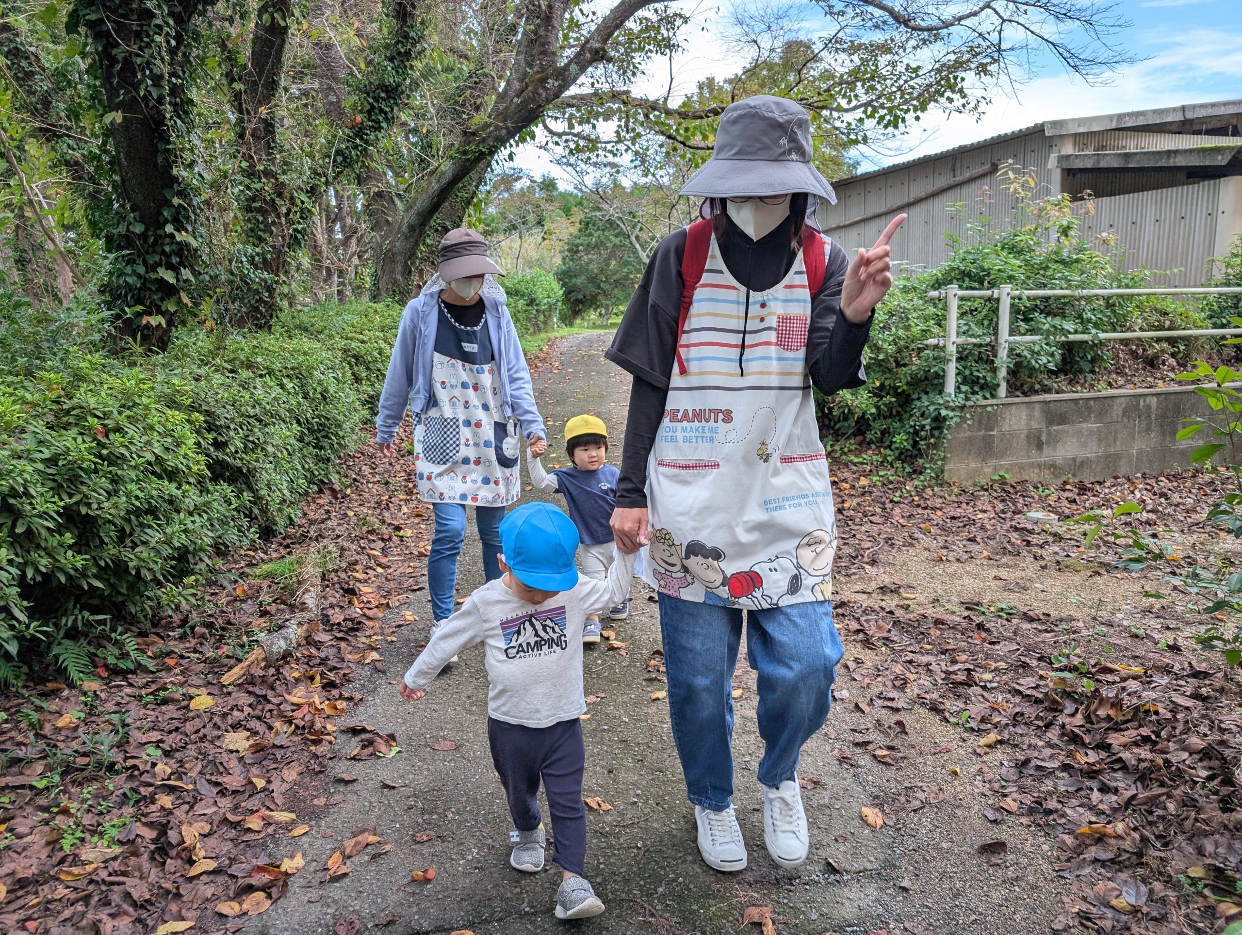 ハイキングへ行ってきました。 【行 事】2025.10.22 日を追うごとに秋が深まってきました。 そんな中、託児所ではハイキングへ行きました。 落ち葉を見て秋を感じたり、重機を近くで見て子どもたちは大喜びでした。
