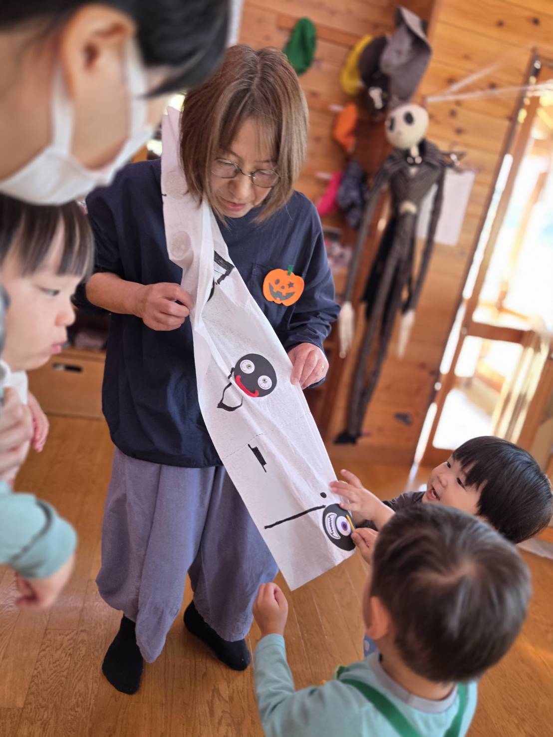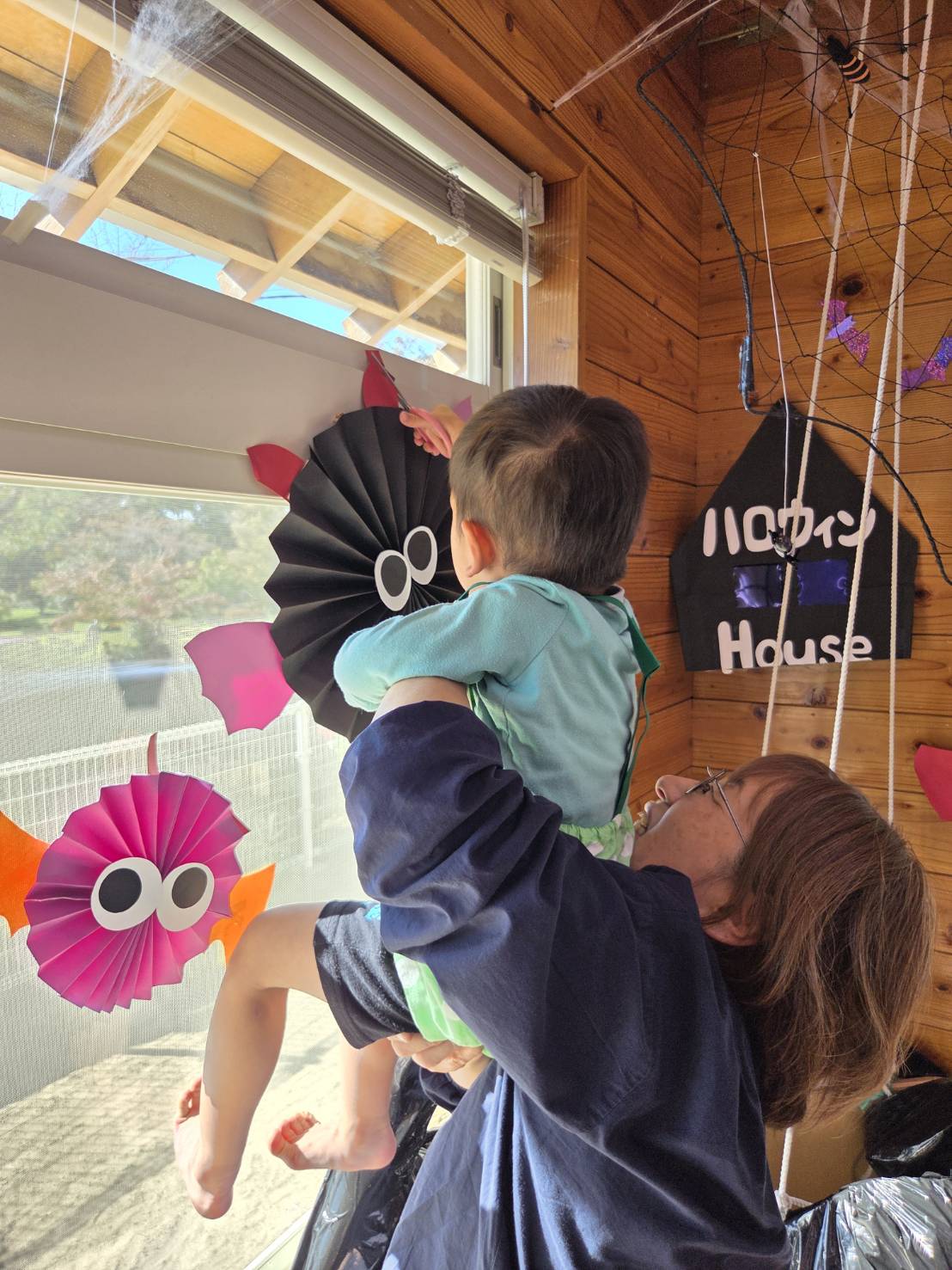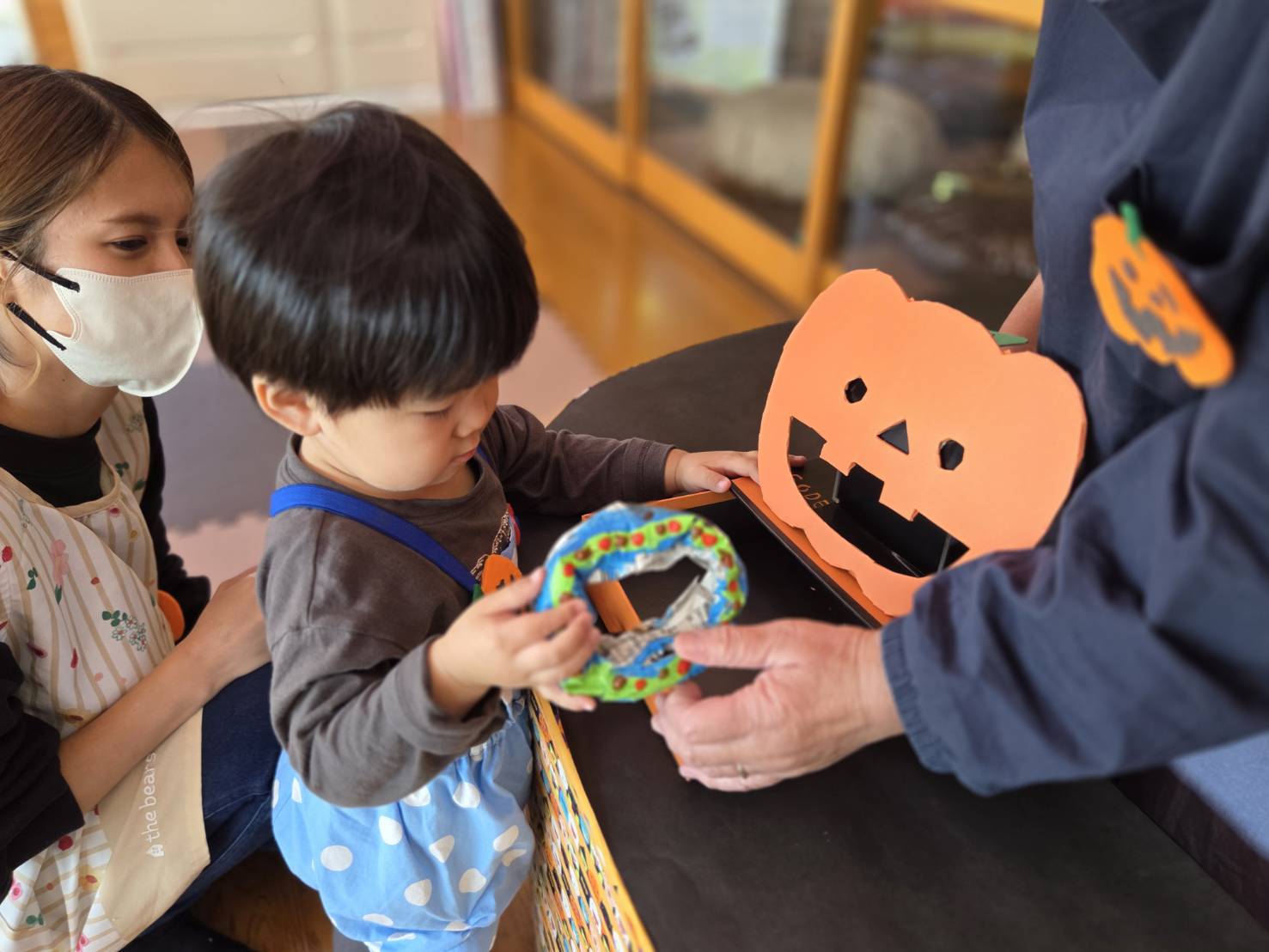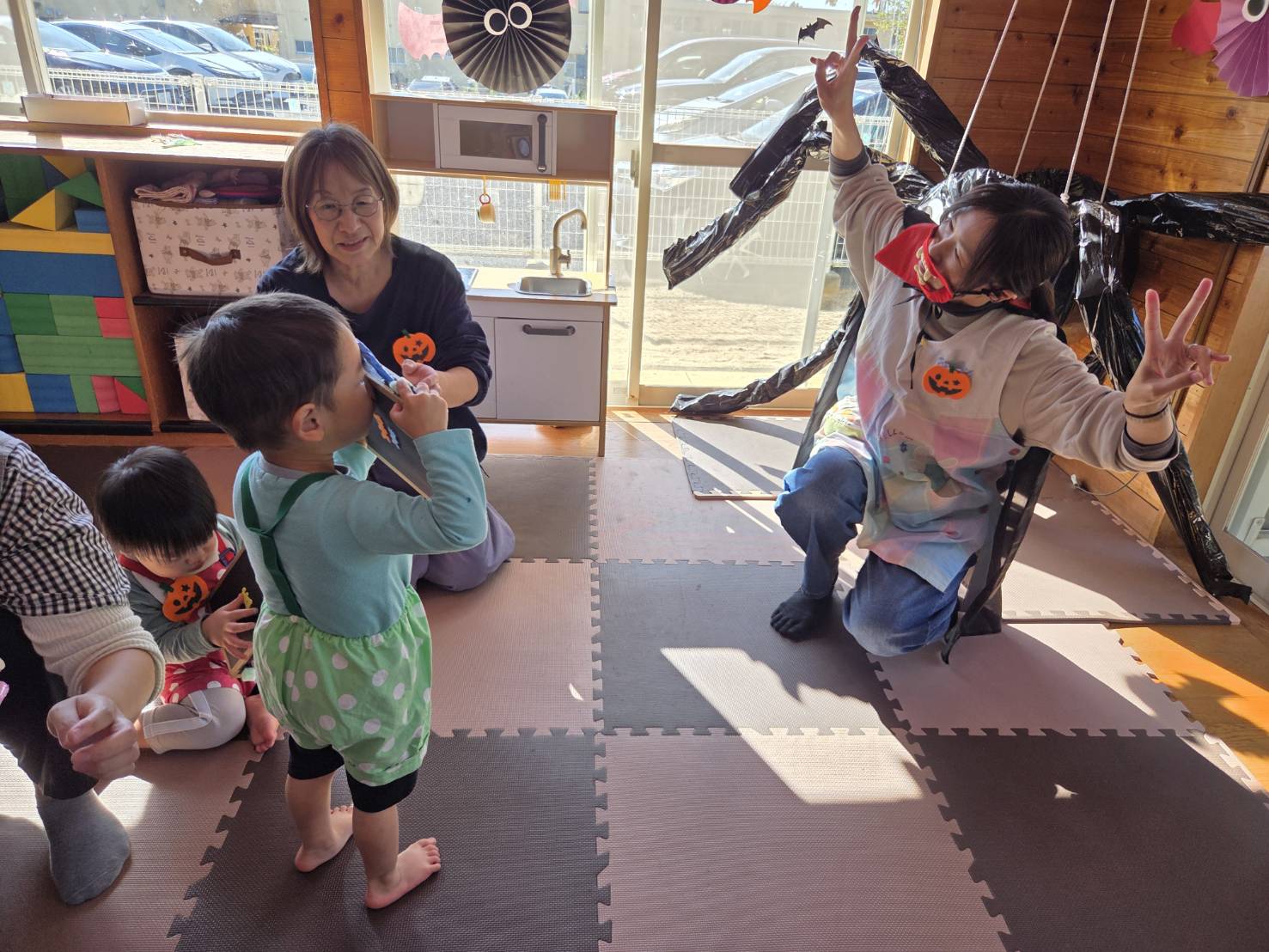ハロウィン 【行 事】2025.10.31 今日はハロウィンです。 託児所でもハロウィンイベントが開催されました。 今年のテーマは「ハロウィン商店街」ということで、託児所内にいろんなお店が出現しました。 『ミュージックショップ魔女っこ』では音符オバケをやっつけたり、『フォトスタジオくも』では悪いこうもりを写真に閉じ込めました。 今回はお父さん・お母さんも参加して親睦会もしました。