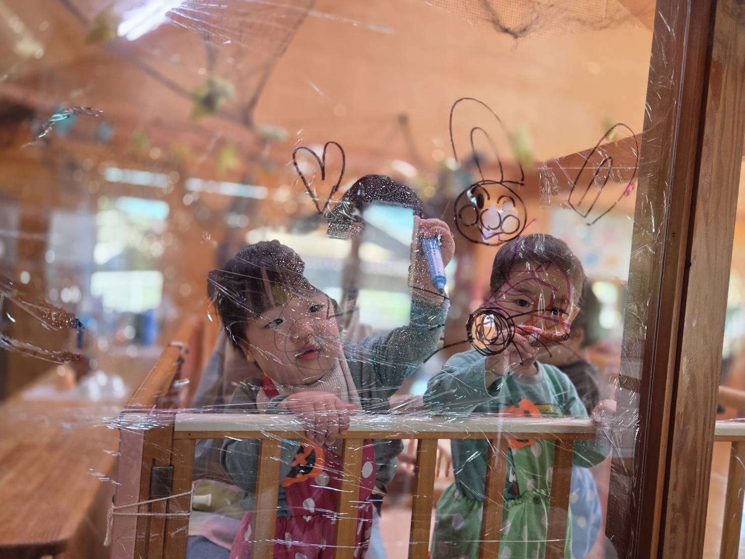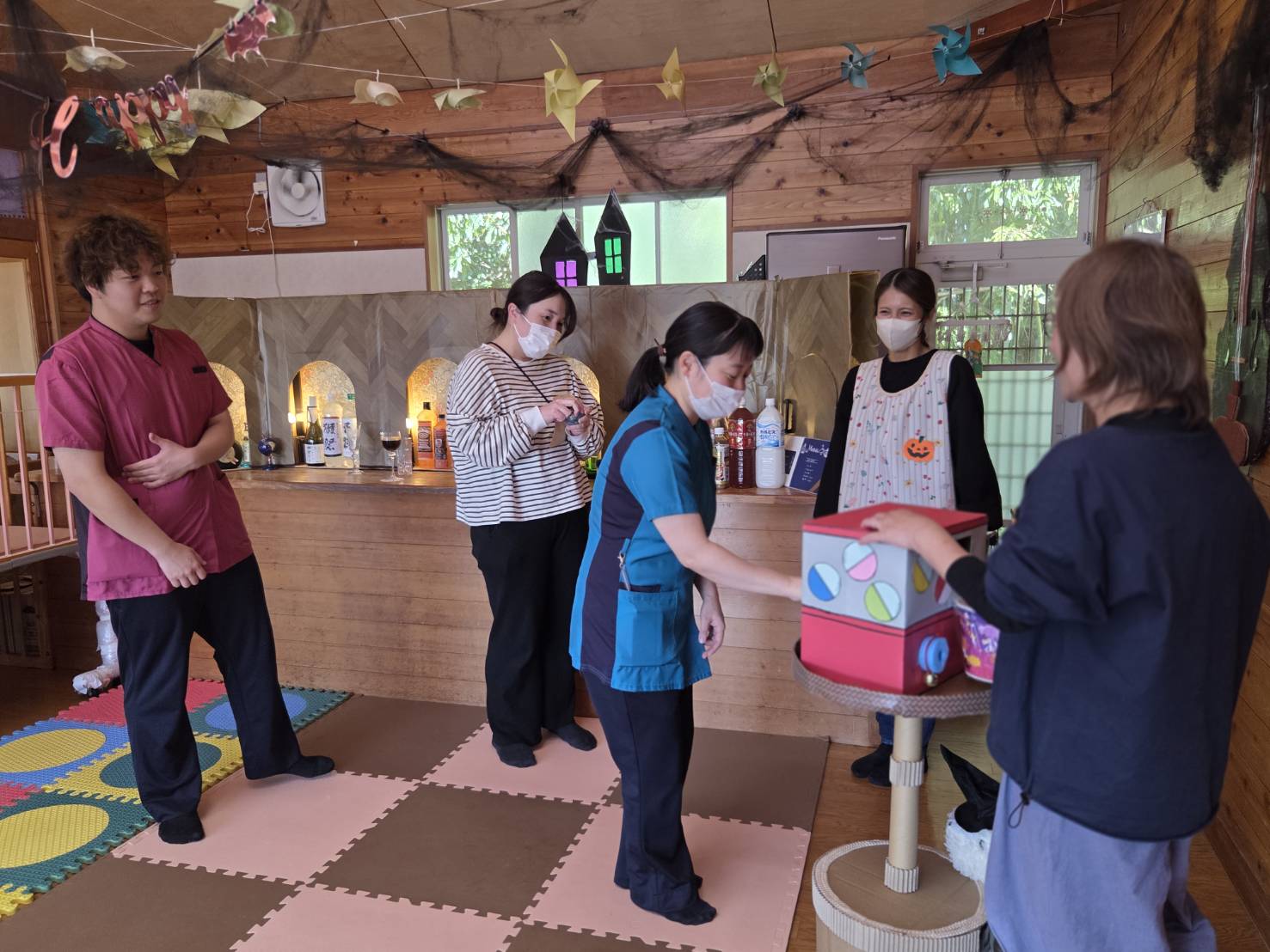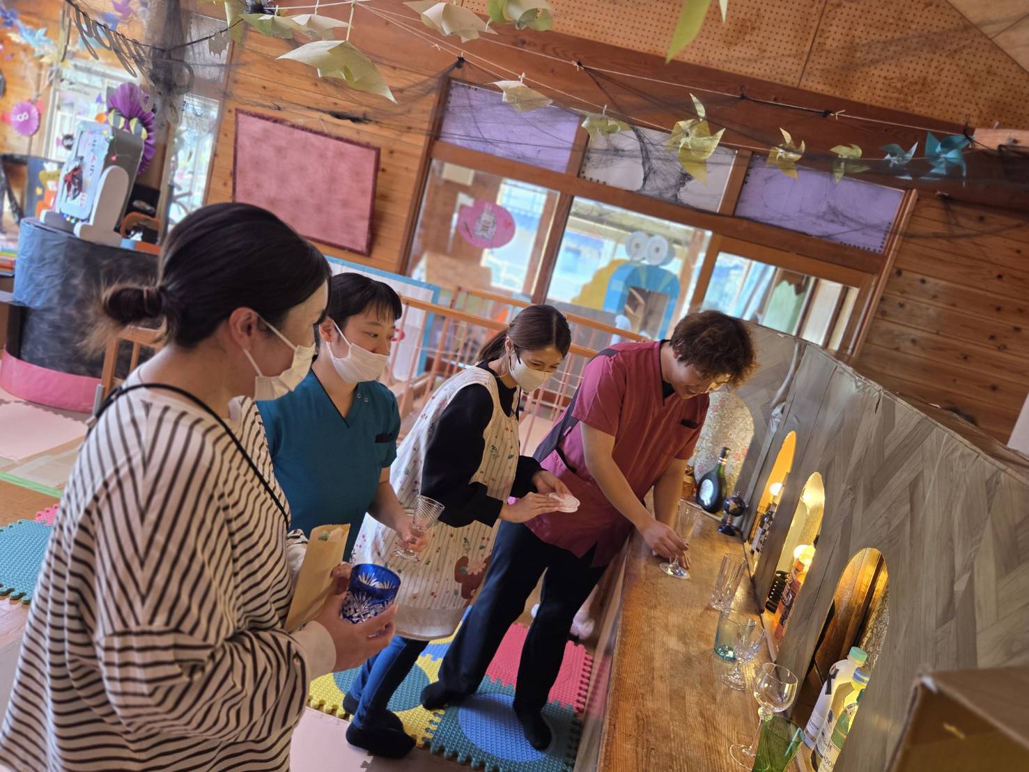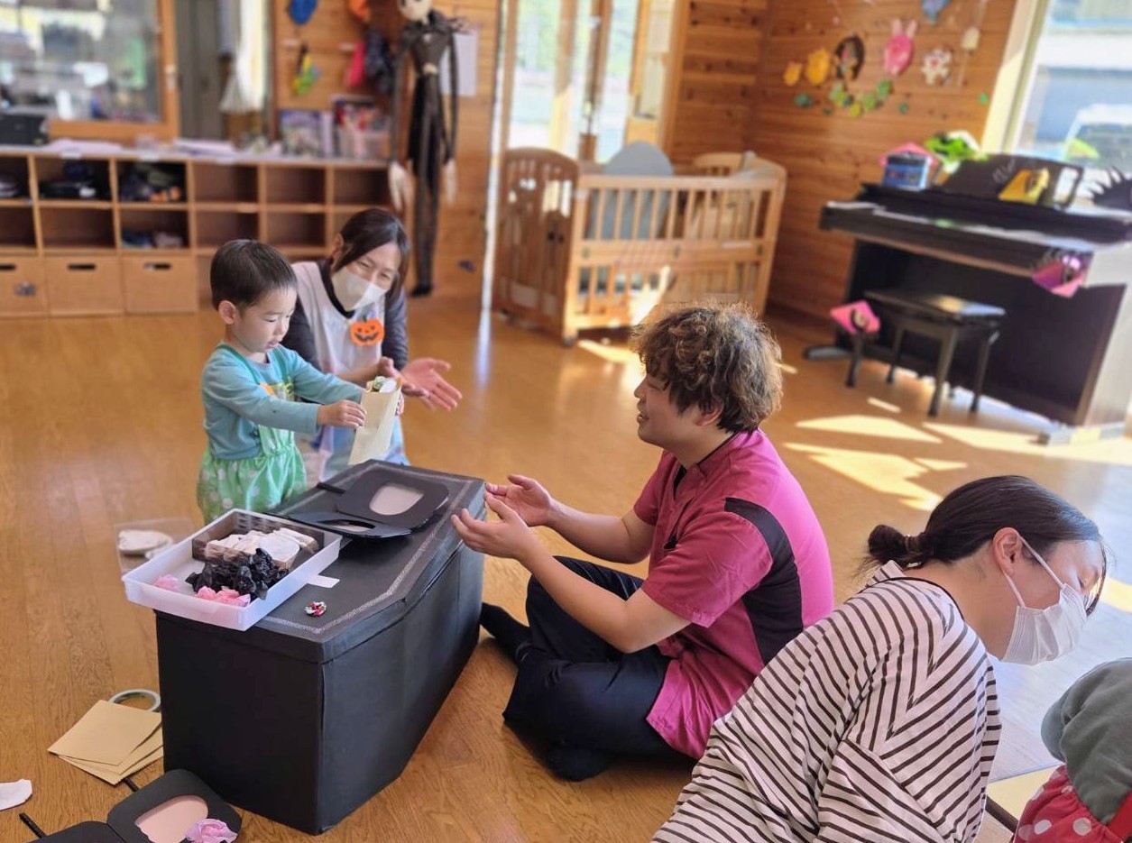 ハロウィン 【行 事】2025.10.31 今日はハロウィンです。 託児所でもハロウィンイベントが開催されました。 今年のテーマは「ハロウィン商店街」ということで、託児所内にいろんなお店が出現しました。 『ミュージックショップ魔女っこ』では音符オバケをやっつけたり、『フォトスタジオくも』では悪いこうもりを写真に閉じ込めました。 今回はお父さん・お母さんも参加して親睦会もしました。