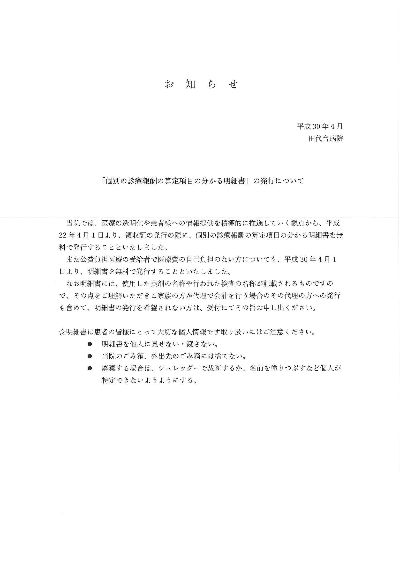 田代台病院ホーム > お知らせ一覧 > 個別の診療報酬の算定項目の分かる明細書の発行について