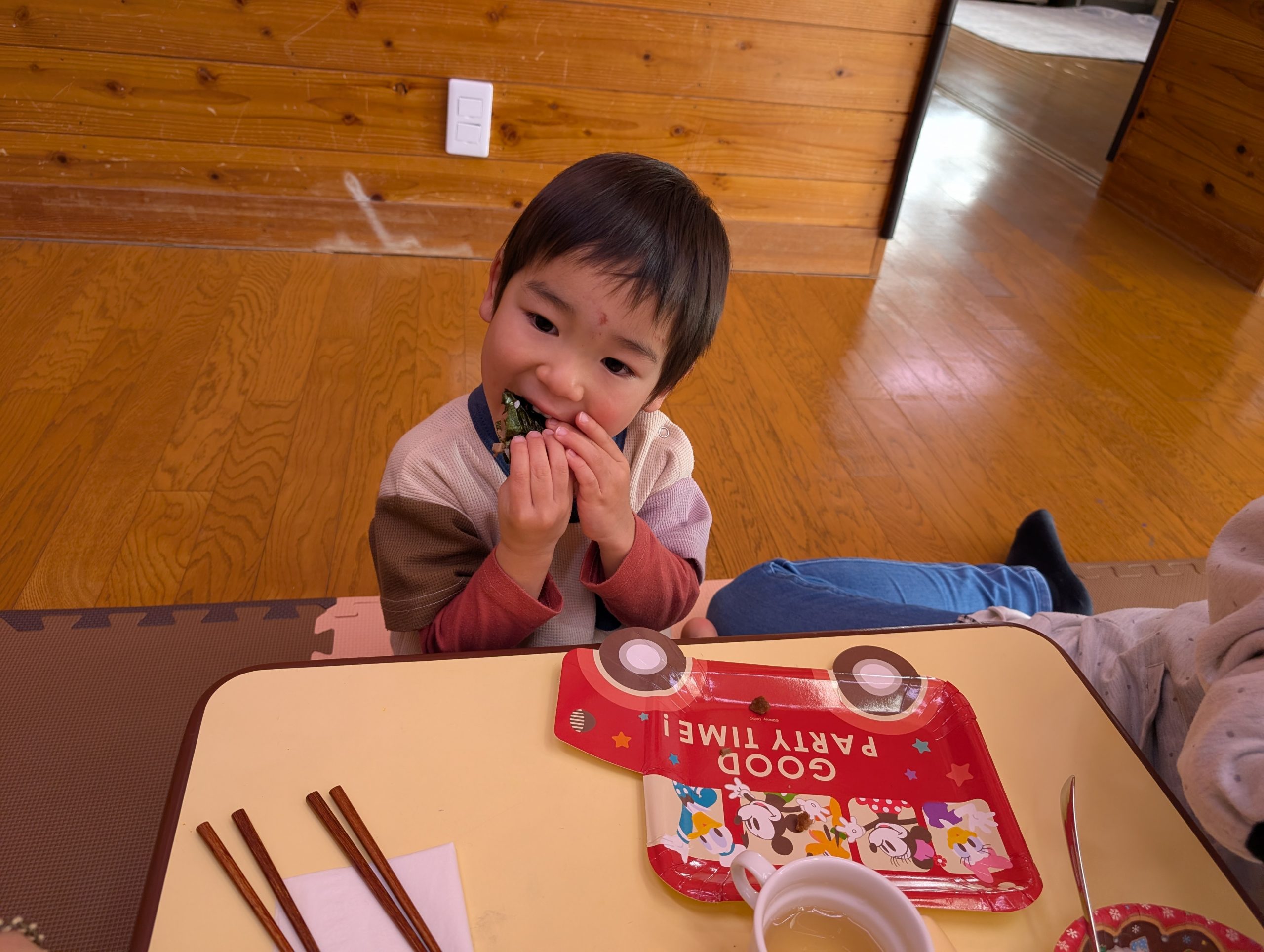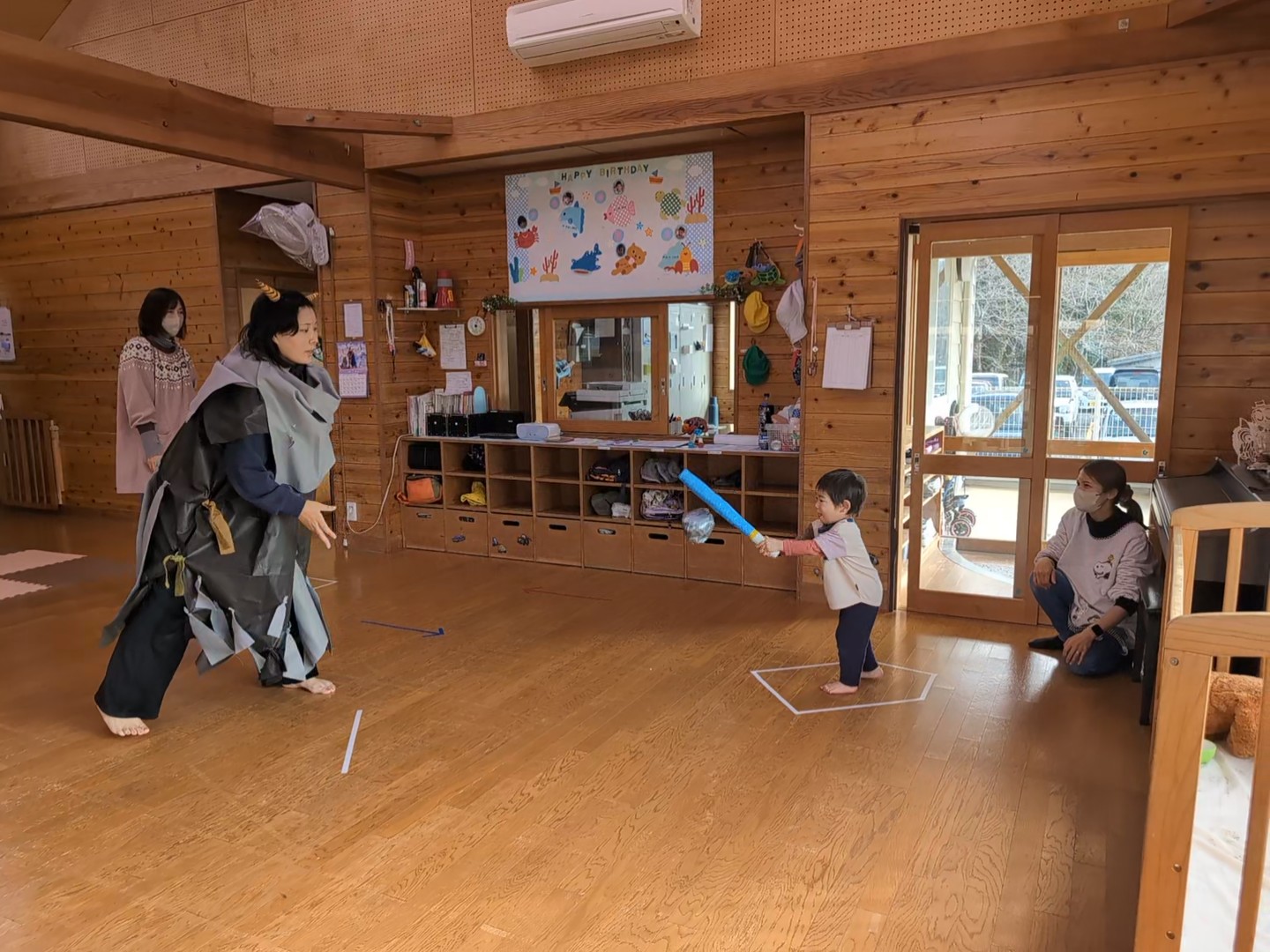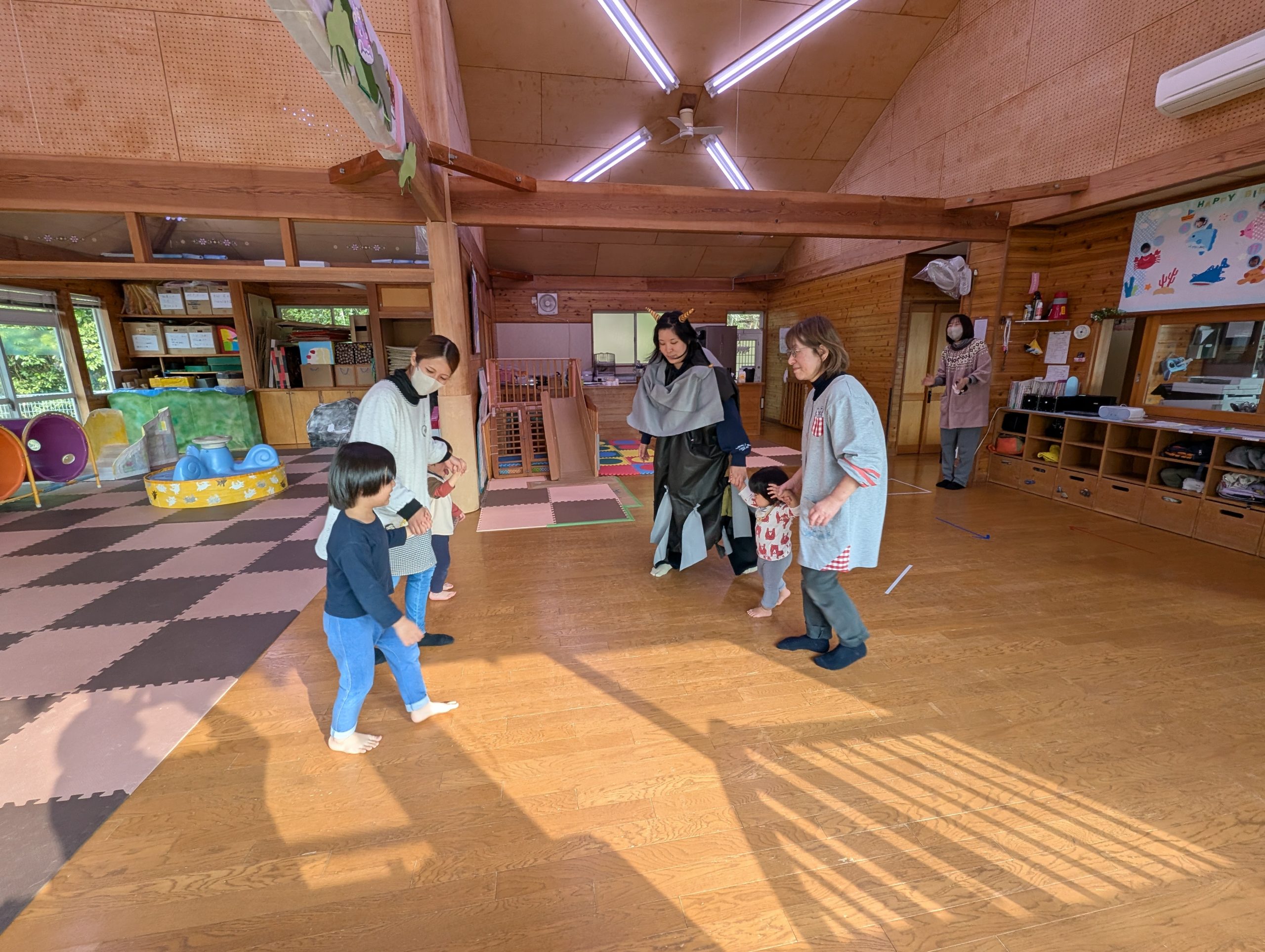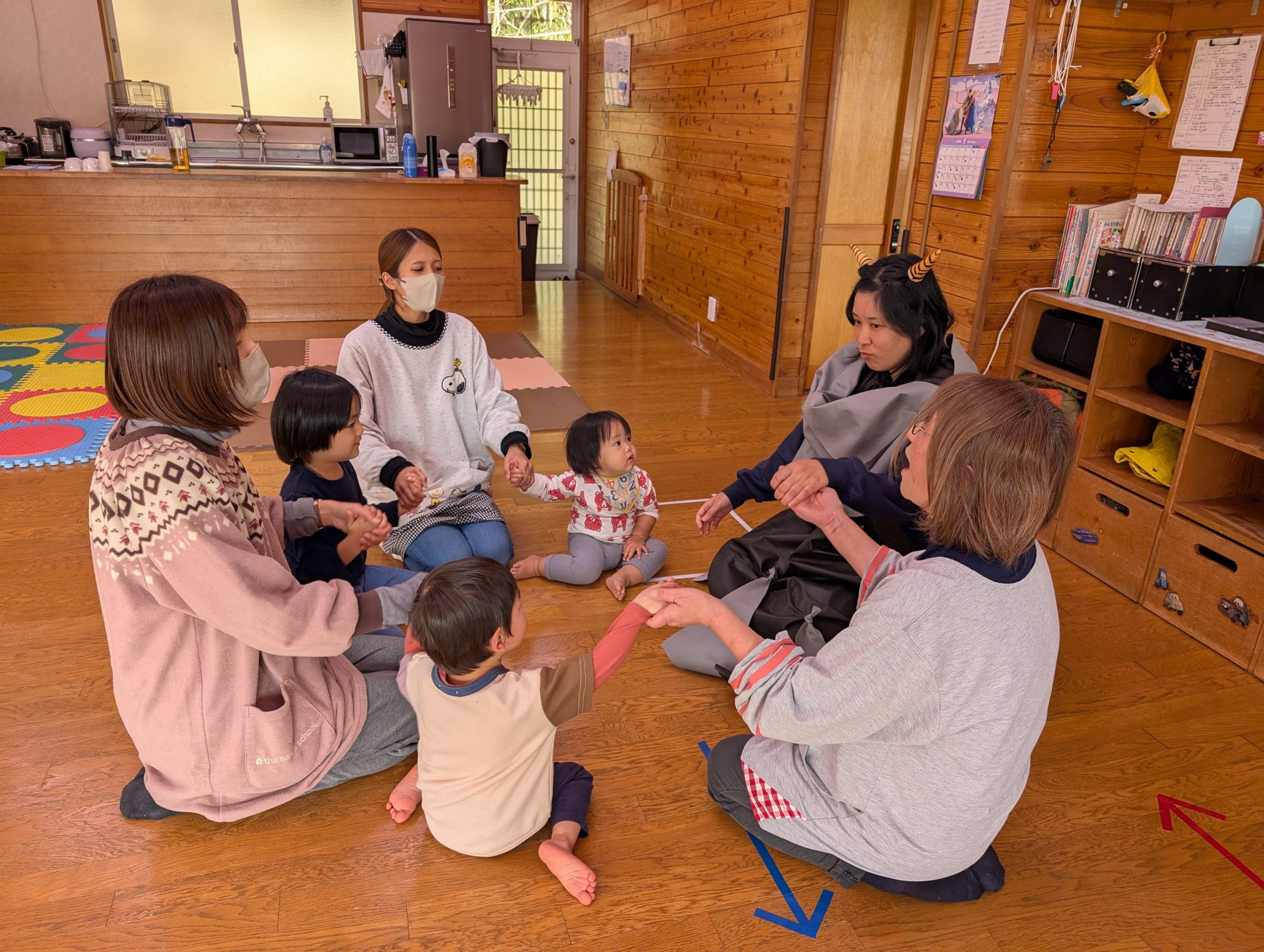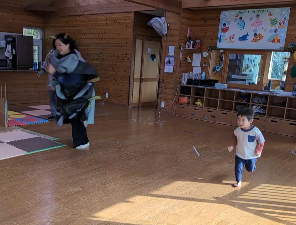 節分 【行 事】2026.01.30 2月3日は節分です。 託児所では、ひと足早く節分の行事がありました。 今年は、〝心の豊かさを探している鬼〟が遊びにきました。 子どもたちと一緒に遊ぶ中で心の豊かさを学び、最後は一緒にいじわるな赤鬼を退治してくれました。